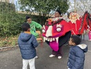 Au fur et à mesure, le groupe trouve de la fluidité. Très vite, il s’échappe de la cour des grands pour rejoindre les maternelles. La rencontre est joyeuse, tout le monde s’amuse de cette créature presque terrifiante, et les plus petits se prennent au jeu de cette déambulation.