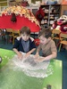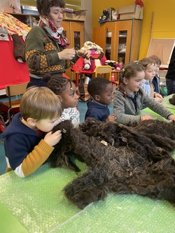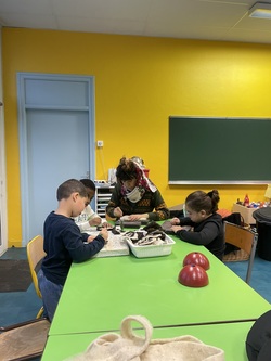 Pour commencer les ateliers, dix élèves de moyenne section sont venu·es découvrir le feutrage à l’eau. Ils ont pu sentir la matière puis la manipuler, en faisant d’abord des boules de laine, puis des formes plates. Avec de l’eau chaude et du savon, ils ont frotté, roulé, plié la laine pour la rendre plus dense. Les résultats ne se font pas attendre, et rapidement, tous et toutes avaient réalisés des formes variées. Dix élèves de grande section sont également venu dans l’après-midi pour s’essayer au même processus.