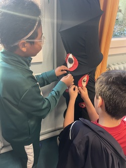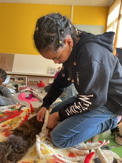 Les élèves de primaire, eux, sont désormais habitués au feutrage : au fil de ces quatre séquences, ils en maîtrisent presque tous les secrets ! Ces deux jours ont donc été consacré à la mise en pratique des différentes méthodes de conception découvertes au cours des ateliers, pour apporter les touches finales au monstre : couture, feutrage, découpage.