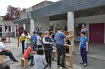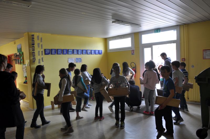 Les élèves étaient en atelier le mardi matin et ont pu avancer sur leur spectacle. L’après-midi, c’est avec la classe de Noémie Cann (CM1-CM2 et quelques élèves de CLIS) que Nicolas Turon a travaillé les dernières scènes. En classe, il fallait trouver des idées autour d’un événement qui aurait marqué le quartier et replacer le chat Pelage de Givre dans ce contexte. Une fois dans la cour, chacun avec son tabouret, les élèves ont commencé par faire un jeu faisant travailler la concentration, la rapidité et les connexions du groupe. La classe a ensuite répété la scène qu’elle venait d’écrire avec la gestuelle et les déplacements prévus lors de la restitution, notamment la construction d’une barre d’immeuble avec des tabourets...
