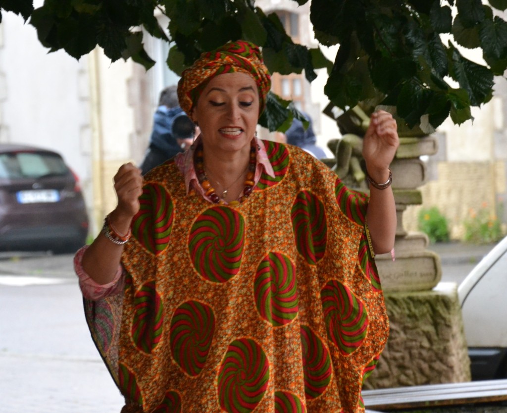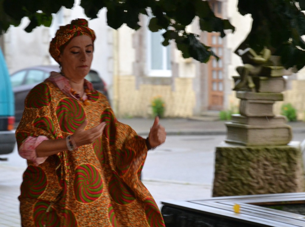 19h12 – Sur le parking de la bibliothèque de Querrien, sous les branches d’un grand arbre qui la protège à peine du crachin qui continue de s’abattre sans pitié, Anne Sybille Couvert se prépare à émerveiller le public avec un conte africain de sa propre invention. Décor approprié pour cette bibliothécaire de formation, conteuse amatrice et débordante d’enthousiasme à l’idée de nous faire découvrir sa passion pour la culture africaine, développée en voyage organisé. Avec son boubou et ses instruments, souvenirs dudit voyage, elle va narrer, mimer et danser l’histoire d’Attifa, petite fille africaine originaire du village de Yambolé. Le tout entrecoupé d’anecdotes.