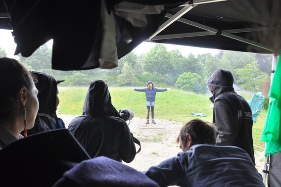 "À Guilligomarc’h nous installons le spectacle pour l’heure de jeux, entre deux averses, il pleut encore dix minutes avant le début du spectacle. Nous aurons beaucoup de chance : pendant la représentation le ciel se dégagera et nous finirons dans un rayon de soleil et une belle euphorie, due également au fait que nous avons trouvé comment intégrer Céline, notre plasticienne et scénographe, dans le spectacle." - Mathurin Gasparini