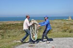 Deux équipes ainsi formées se font face pour écouter le message de haute importance qu’une élève du collège délivre alors : un projet de téléphérique reliant Molène à Ouessant, ou l’inverse. Et c’est d’ailleurs pour déterminer d’où partira la première cabine, qu’Olivier demande que l’on organise un concours de tir à la corde ! Ni une, ni deux, les équipes s’installent, et commence l’effort ! Après avoir bien épuisé les bras des équipages, on se rend compte que cela n’était pas nécessaire. Et bien oui, le téléphérique aura deux cabines, qui partiront simultanément d’une île et de l’autre !