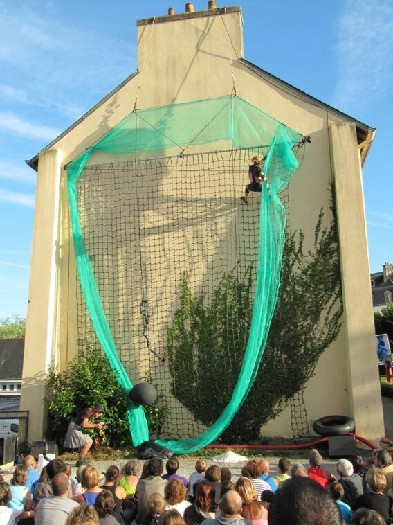 Sur les hauteurs de la ville, 3 spectacles m’attendent pour bien débuter la soirée. Sur le pignon d’une maison, Jean-Marie Maddeddu et Antoine Le Ménestrel ont hissé leur filet dans lequel la Chimère que je suis se me laisse facilement prendre.
