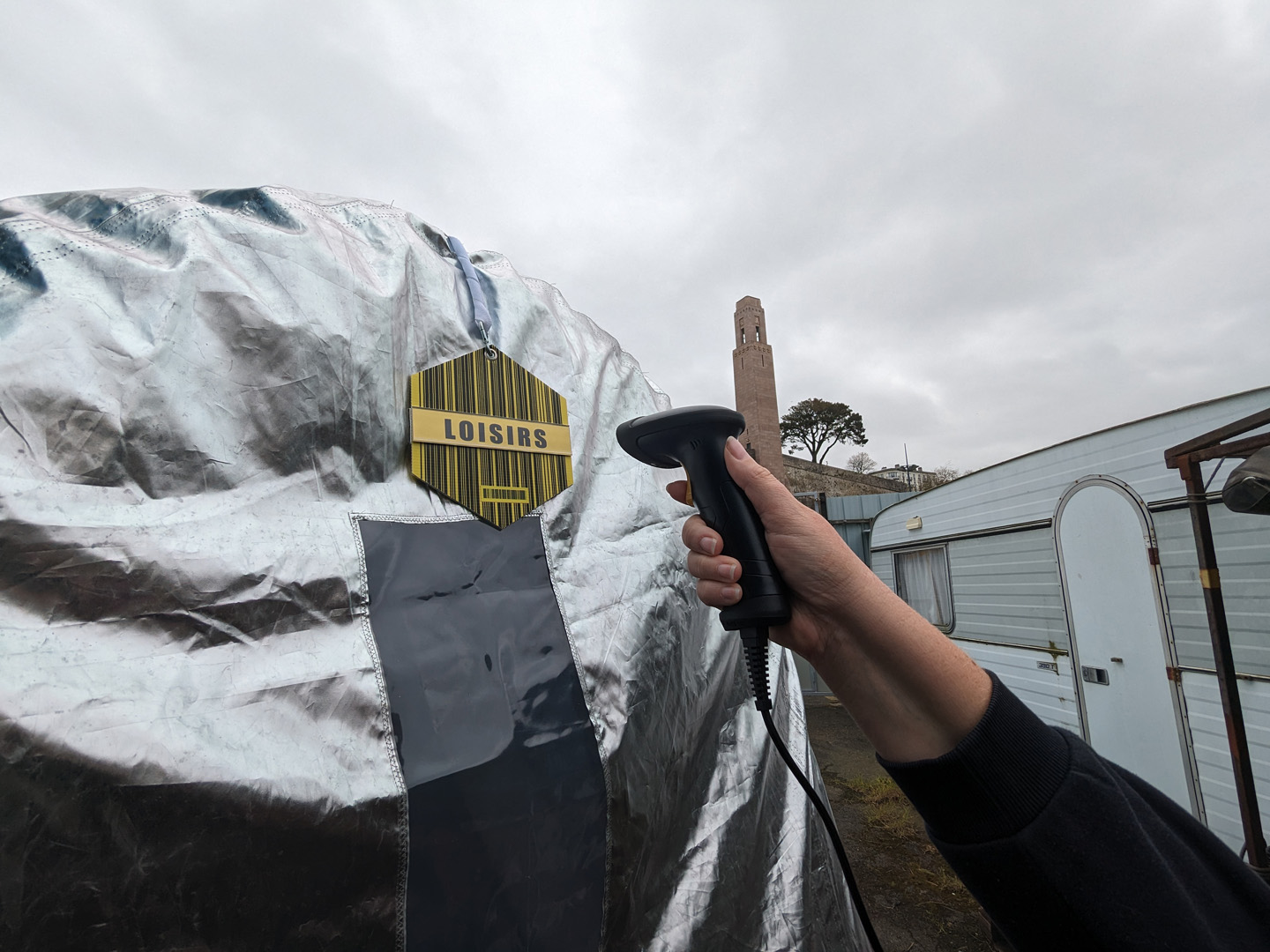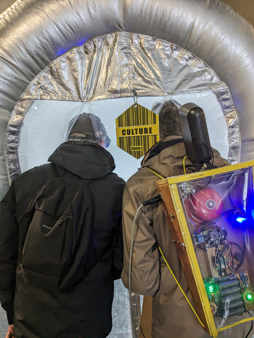 Une fois les informations bien en tête, le public est équipé d’un "sac à sens", sac à dos low-tech, technologique et sonore, conçu par Théophile Rousic-Plantec. Ce sac à dos est relié à une douchette qui permet de flasher des codes-barres et à une boussole vocale qui tient le rôle de compte à rebours de 20 minutes. Car oui, le public embarque bien pour un tour de 20 minutes autour de l’installation.