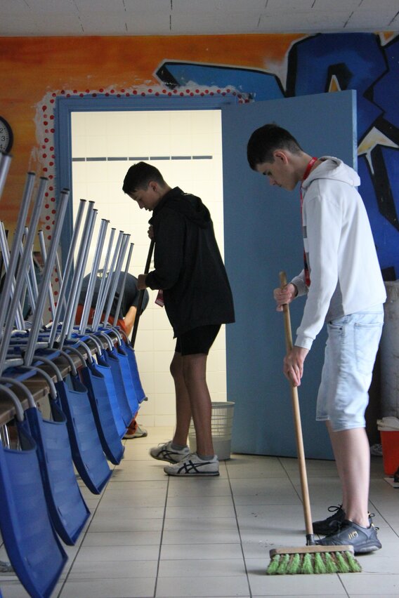 Premier étape : mettre les chaises sur les tables pour nettoyer le sol.