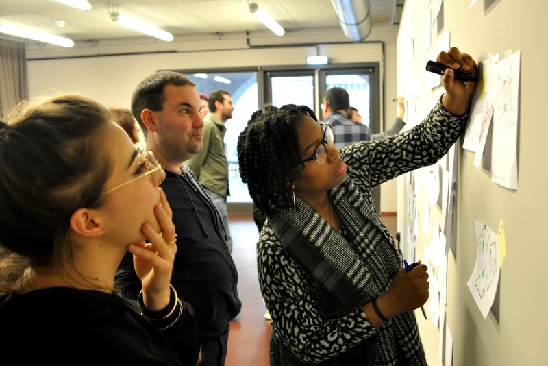 Pour cela, chacun des groupe est accompagné par deux designers des ManufActeurs. Sur les deux tables, les esquisses et croquis se succèdent, les interrogations sont nombreuses. Plusieurs groupes retournent arpenter les espaces publics pour déterminer les emplacements judicieux.