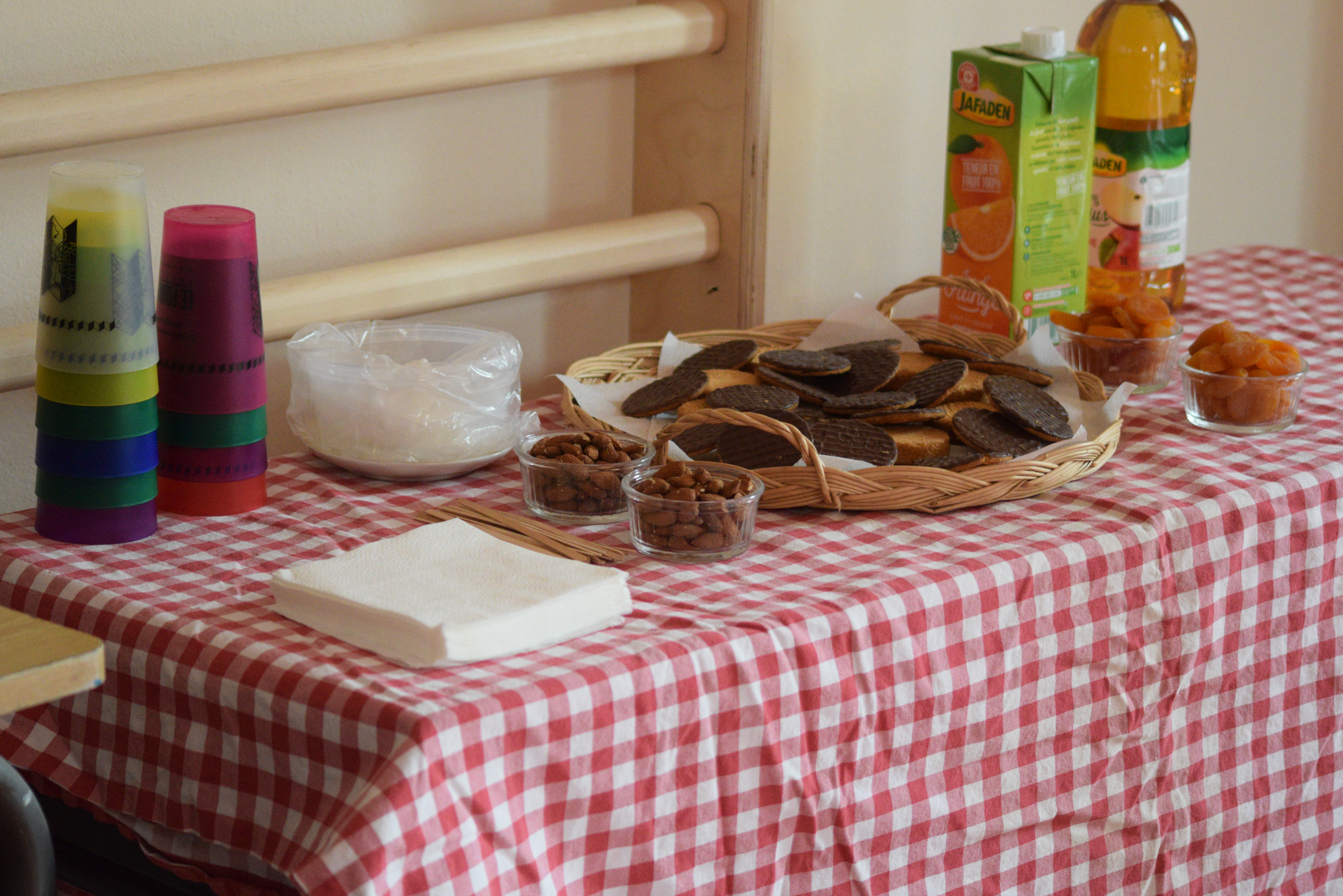 Sous la direction de Marine, nous installons le buffet pour les artistes et un petit espace pour le maquillage.
