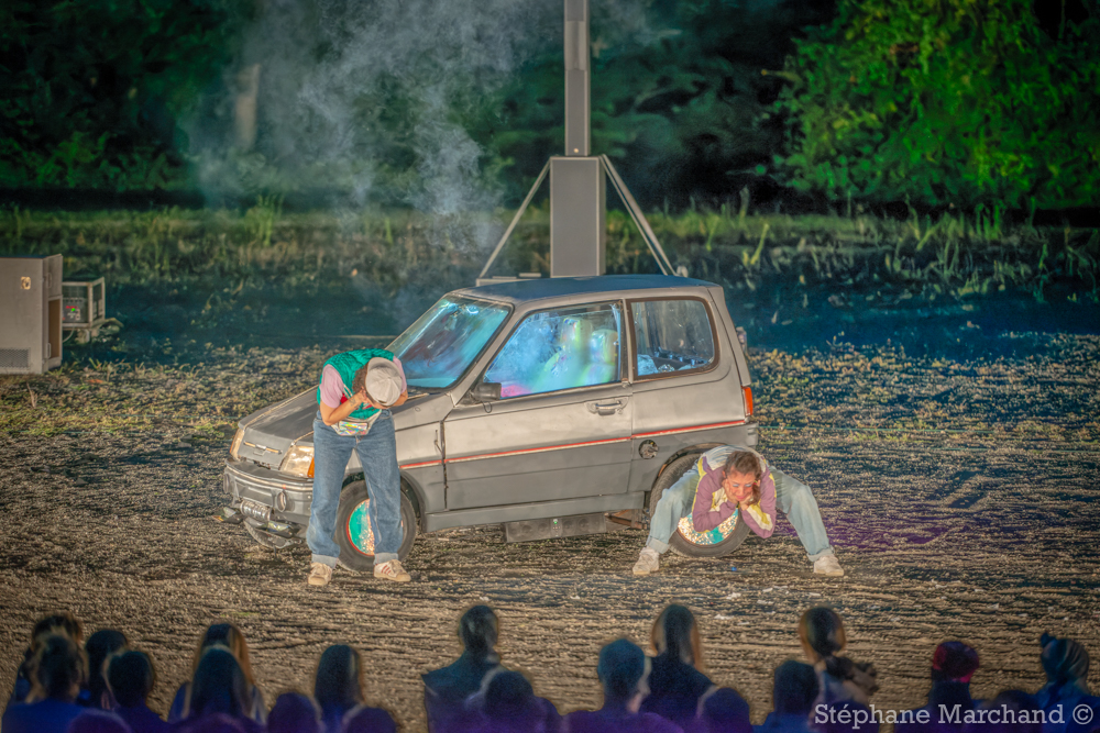 « Trois personnes innocentes, une voiturette presque réparée, de la danse de télé, un chat dans le moteur, de l’acrobatie presque impressionnante, beaucoup l’imagination, du théâtre pas diplômé, un manque de distance avec la vie, de la loose, de la romance des 90’s et pas mal d’indélicatesse.