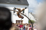 Une toupie abandonnée à sa trajectoire circulaire est mise en mouvement par deux funambules. Se reflétant l’un l’autre, le duo cherche l’équilibre de cette sculpture mobile géante afin d’atteindre le moment de suspension, ou au contraire, de provoquer la dynamique et la rotation. Une histoire s’écrit alors avec la gravité.