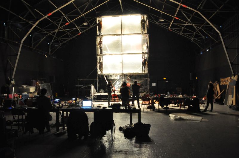 Comme pour Page Blanche et Quatre Soleils, un échafaudage s’est dressé dans la grande halle. Cette fois-ci, il mesure plus de 8 mètres de haut et contient six tableaux. Et c’est un chœur de six peintres qui y prend place, accompagné par deux musiciens et une comédienne. Recherche des images, mise en musique, filages, l’équipe est actuellement à la moitié de la création qui devrait être présentée au public cet été.