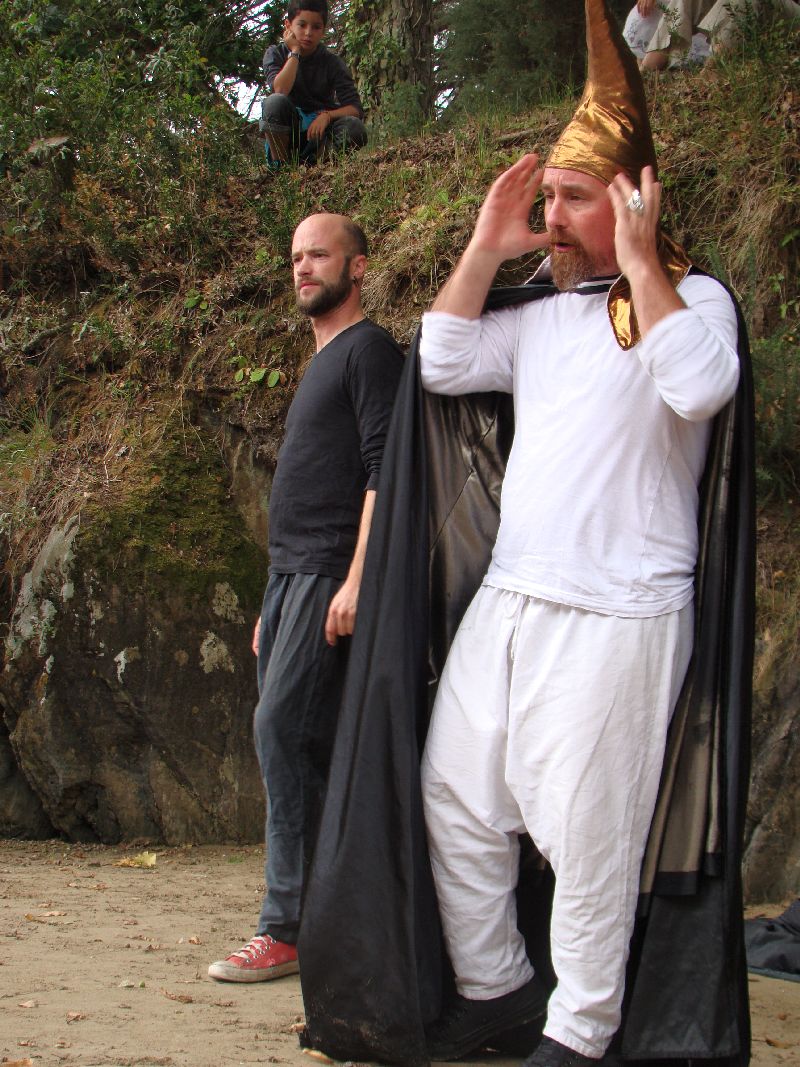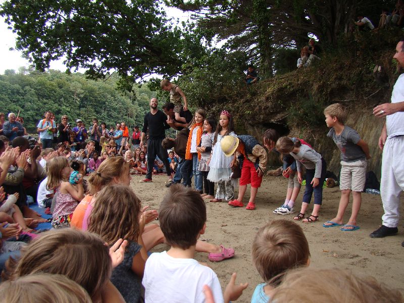 C’est sur les rives du Belon, près de la chapelle St Léger, que s’est rejouée la fabuleuse histoire de princesse courage. Regrettant amèrement le départ des comédiens de leur compagnie, et la disparition étrange et simultanée du matériel, Laurent et Manu, les Batteurs de Pavés, ont fait appel au public pour remplacer les acteurs... Débordant d’imagination et rebondissant sur les qualités des comédiens en herbe, ils nous ont présenté une unique représentation drôle et dynamique de la pièce.