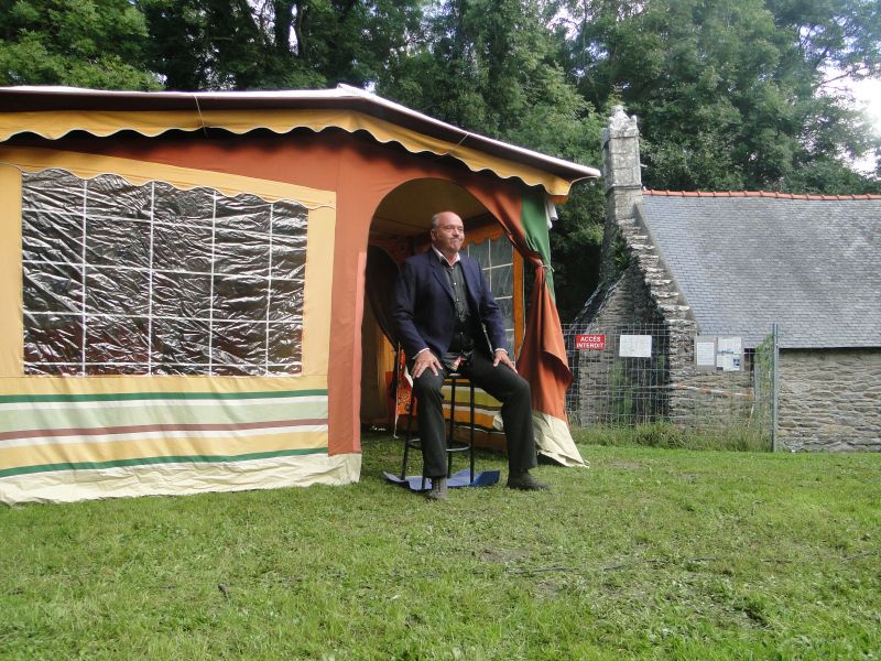 16h16 – Juste à côté de la jolie chapelle St Guénaël de Moëlan sur Mer, une petite caravane a été installée. Une hôtesse accueille les spectateurs et les installe à même le sol sur des moquettes. L’atmosphère est champêtre et dans cette petite clairière entourée de hauts arbres, on est comme coupé du monde. Et pourtant, la réalité va se rappeler à nous en la personne de Bernard « Deux L », un grand gaillard de deux mètres.