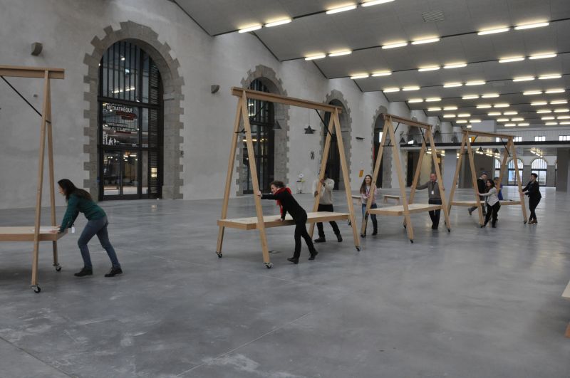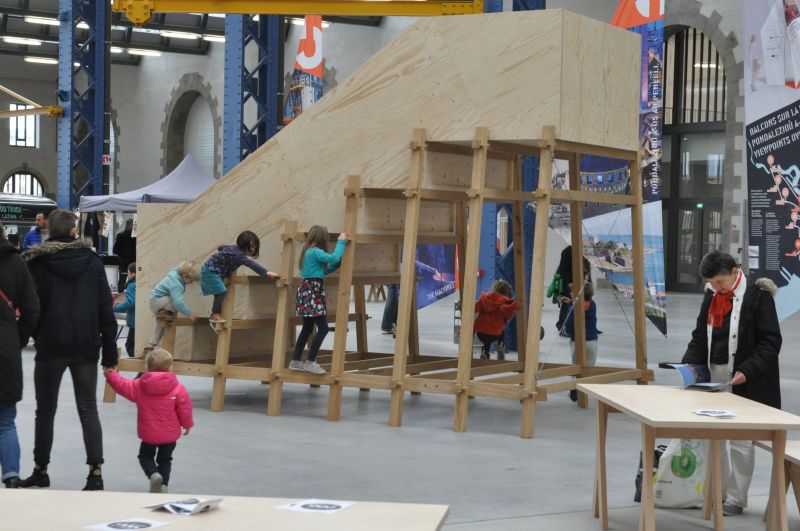 Sur l’immense Place des Machines, les mobiliers assemblés durant la semaine par Bureau Cosmique n’attendaient plus que leurs premiers usagers. Le module central, tel un kiosque, a accueilli Chez Capucine. Animés par Passerelle durant les deux après-midis, ces temps ludiques ont rassemblé de nombreux enfants autour de la construction d’une ville imaginaire. Du côté de la caravane rouge du Fourneau, les passants ont pu échanger avec l’équipe de la Fabrique citoyenne et poétique sur la démarche participative.