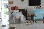 Marie-Do fait son entrée, moustache bien dessinée, robe de mariée colorée.