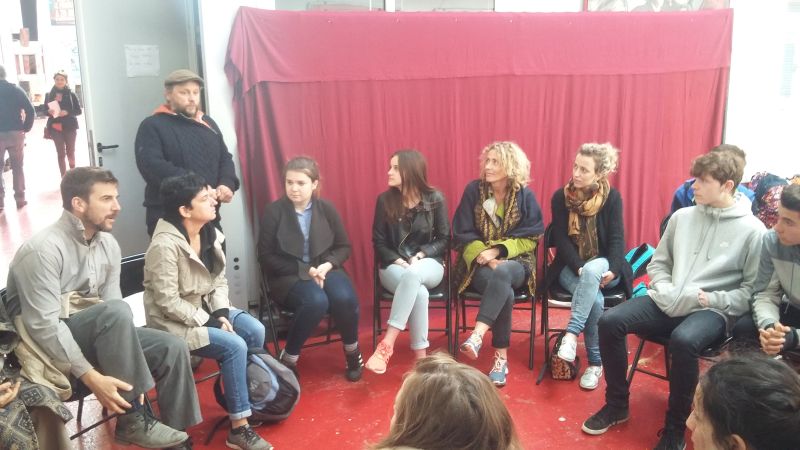 Dans cette idée de transmission et d’échange artistique, ils ont donc préparé avec leurs professeur.e.s une escapade brestoise le jeudi 04 mai 2017. Après avoir interviewé et filmé les différents membres permanents de l’association, les élèves ont eu l’occasion de rencontrer la Fausse Compagnie, en résidence de création dans la grande halle du lieu de fabrique. Une manière pour eux de prendre conscience de l’importance d’un cadre adapté pour travailler sur un projet artistique. Ils ont ainsi pu découvrir l’émouvant projet artistique Vibrato , dans un kiosque atypique : véritable mobilier ludique et poétique imaginé par la compagnie, servant à la fois de scène urbaine et d’espace d’accueil. Celui-ci a permis de créer une réelle intimité entre les artistes et ces jeunes caulnais.e.s. Ils ont ensuite prolongé la rencontre par un temps d’échange durant le déjeuner dans la petite halle du Fourneau.