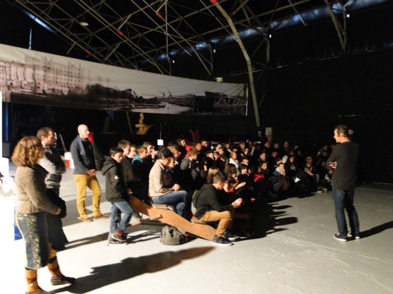 Après un pique-nique (désormais traditionnel) dans la Petite Halle, les élèves se sont dirigés vers la Grande Halle où les attendaient les artistes de Dédale de Clown et Black Box, compagnies associées au projet cette année, pour une présentation des actions à venir dans le cadre du jumelage.