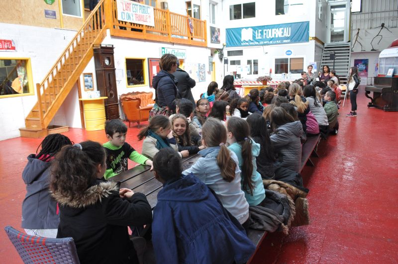 Arrivées à 10h30 au Fourneau, les classes de CE2-CM1-CM2 et la classe de CLIS ont été accueillies par Lucile, l’administratrice de la compagnie et par Alice,chargée des relations artistes-habitants au Fourneau.