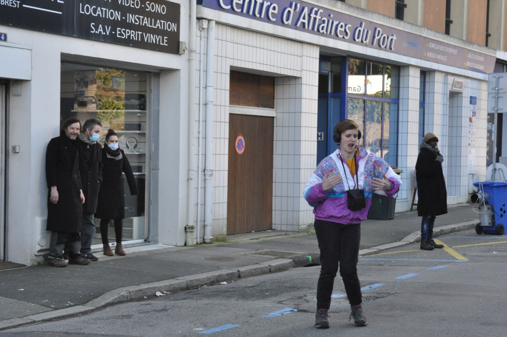 Le restant de l’équipe du Fourneau en profitant pour assister au filage dans l’espace public du travail de la compagnie.