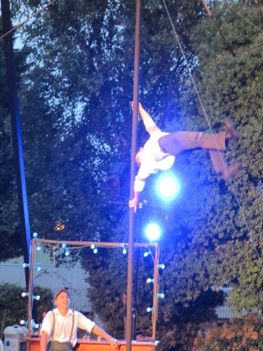 En raison d’une impossibilité de jouer de la compagnie Escale (pour raison de blessure d’un artiste), ce sont les Krilati qui ont pris possession de la place. L’ambiance est plutôt cabaret, tant dans les tenues que dans le décor mais le bar se trouve au centre d’une immense structure de métal et de cordes que les artistes vont vite investir.