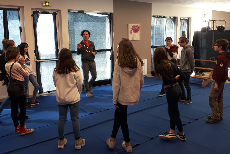 De nouveaux ateliers théâtre ont eu lieu avec les classes de 6ème qui avaient déjà été initiées à cet art par Gildas en décembre 2018 > Lire le reportage. C’est en demi-groupe que les jeunes collégiens ont profité de 2h30 de pratique théâtrale aux côtés du comédien de Galactic. Au cours de la séance, plusieurs défis sont à relever : comment marquer sa silhouette ? Improviser sur un sujet donné au hasard ? Désigner quelqu’un en utilisant simplement le son de sa voix ? Parler le plus vite possible sans fourcher ou encore jouer une scène devant ses camarades de classe ? Autant de challenges relevés dans la bonne humeur par les enfants.