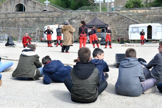 Un groupe de 4e du collège Alain de Crozon vient rencontrer la compagnie le lundi 27 mai. Après un temps de répétition, toute l’équipe des Souffleurs prend le temps de se poser pour échanger avec les collégiens.