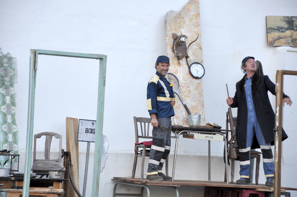 Deux ouvriers s’activent pour déblayer et trier ce fatras d’objets en tous genres. Soudain, ils se prennent à un jeu de construction. De surenchères en supercheries, ils s’approprient les objets et chacun d’eux s’invente son « petit chez soi ». Progressivement, deux habitations de fortune se déploient devant le mur : le tas devient habitat. Ils y jouent à voisiner et fantasment un mode de vie. Peu à peu, les passions s’aiguisent et les entraînent dans l’excès et la folie. L’absurdité de leurs comportements finira-t-elle par leur nuire ?