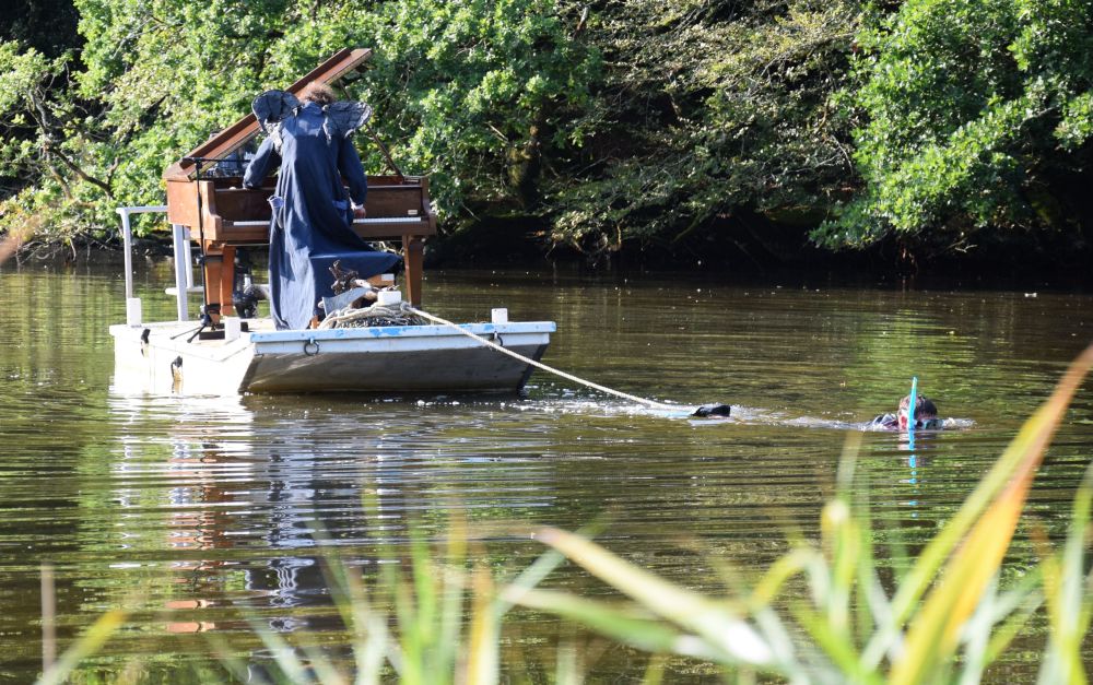 Les rayons du soleil réchauffaient tranquillement l’atmosphère, quand les premières notes de piano ont résonné, comme sortant de l’eau. Précédé par quelques ondes à la surface de l’eau, un piano est apparu, tiré sur une barge par une étonnante silhouette aquatique... Une ouverture onirique écrite avec la complicité de Léo Haag et son piano voyageur, les accordéonistes de Ça va valser, et Raymond Brélivet, alias "Ki-dour", la loutre en breton.