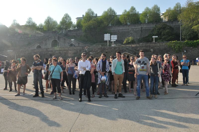 Lundi 7 mai 2018 à 19h12, le parvis du Parc à Chaînes s’est vu habillé de carrés blancs et de micros pour l’expérimentation publique de Parrêsia #2. Les artistes du collectif Bonheur Interieur Brut testait leur dispositif-performance visant à interroger la prise de parole sur la place publique. Des curieux de tout âge se sont rassemblés sur le parc à Chaînes, guidés par les cinq comédien·ne·s.