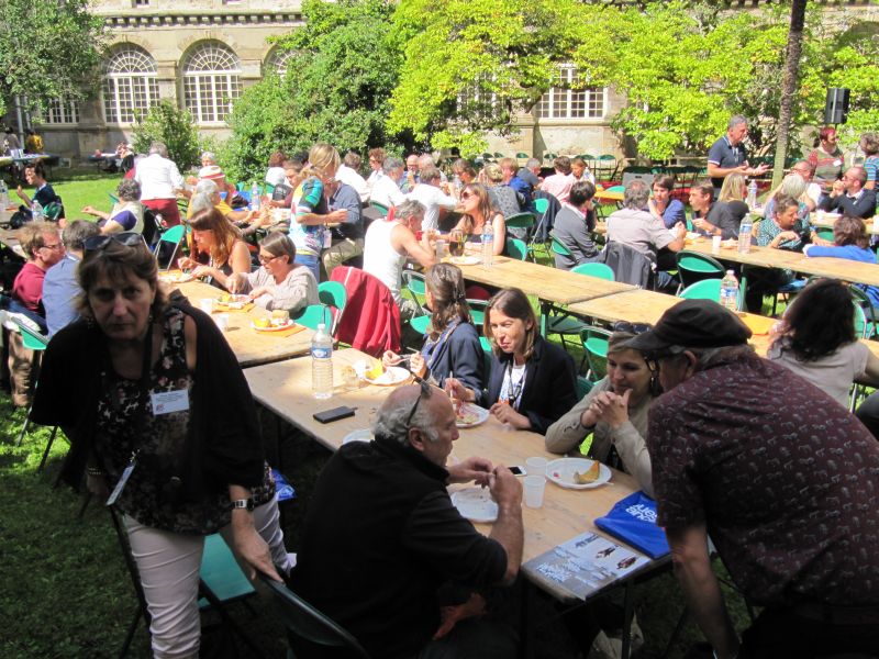 Une centaine de professionnels, programmateurs ou responsables de salles, artistes ou membres des compagnies, médias et élus des collectivités se sont donnés rendez-vous dans le jardin de l’ancien couvent. En début d’après-midi, un échange collectif est organisé par le Fourneau sur le thème « Création artistique en espace public : censure et autocensure ». La journée permet aussi aux professionnels d’assister aux spectacles programmés. Pour l’instant, ils débutent les conversations autour d’un buffet ensoleillé tandis que les élus de la COCOPAQ y organisent une rapide réunion !