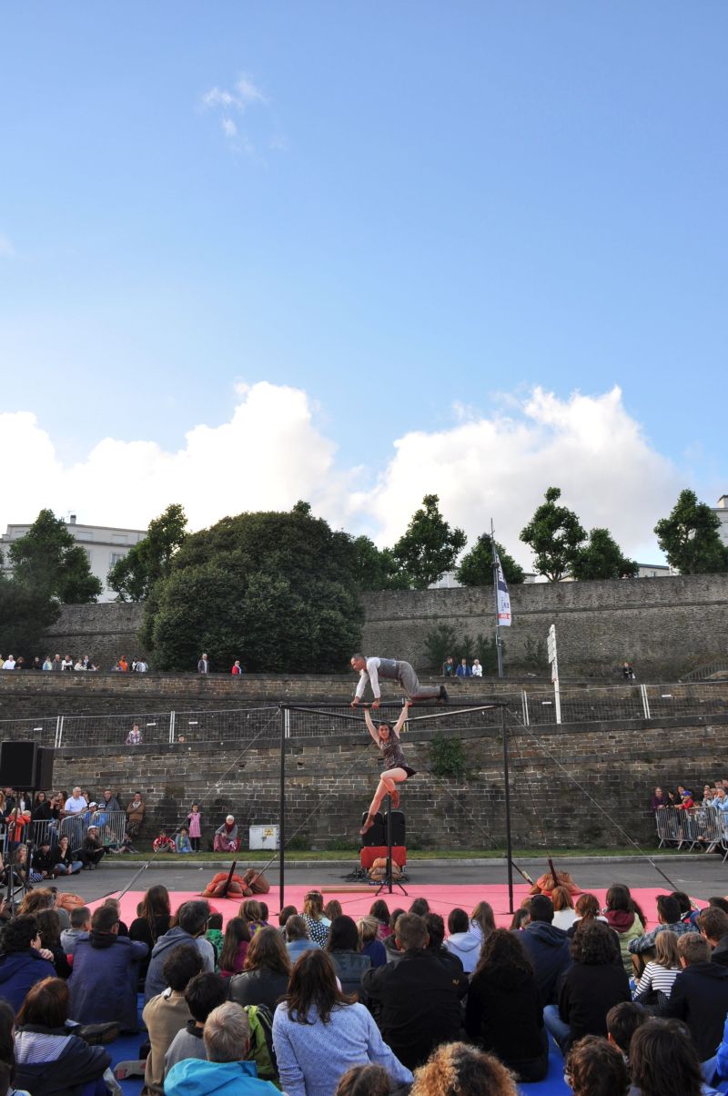 La Compagnie Daraomaï venue de Carcassonne foulait pour la première fois les quais du port de Brest. Elle a présenté à 19h46 sur le Parc à Chaînes son spectacle TiraVoL devant près de 600 spectateurs de tous âges. L’histoire d’une rencontre entre deux cultures, entre deux circassiens virevoltant sur des agrès musicaux étonnants. La nuit tombée, à 22h42, c’est la compagnie Cirque exalté qui, dans une ambiance rock électrique, a offert un spectacle jubilatoire aux 1000 personnes présentes avec Furieuse tendresse  !