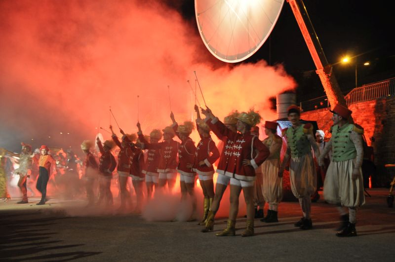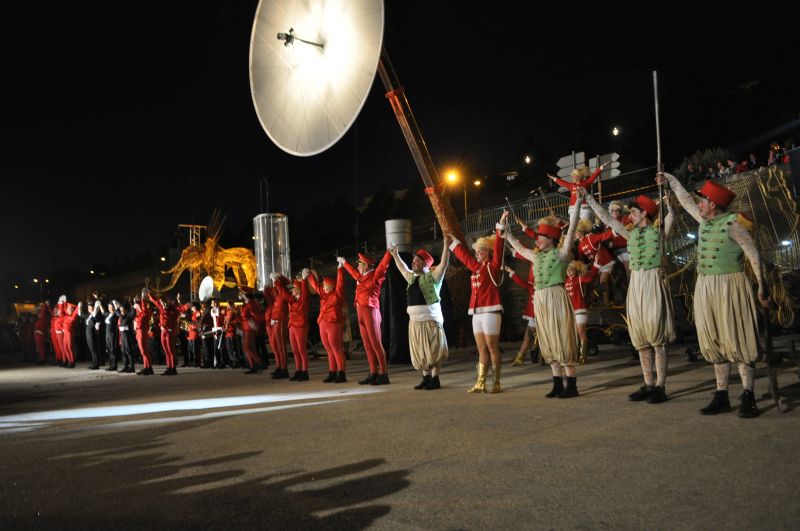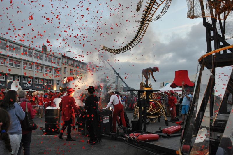 Beaucoup de monde sur le port pour ce 2e Jeudi du Port. Accompagné par 50 embarqués volontaires et musiciens, majorettes et garçons de piste d’un soir, la Compagnie Off a arpenté le port au son des cuivres de la fanfare La Banda Freux avec ses chars, son directeur de cirque, sa diva et son dompteur de tigre ! Sous des pluies de confettis rouges et tirs de boulets de canon en mousse, les brestois ont vécu une belle déambulation circo-lyrique de la Criée jusqu’au Parc à Chaînes où a eu lieu le final de cette Grande Parade .