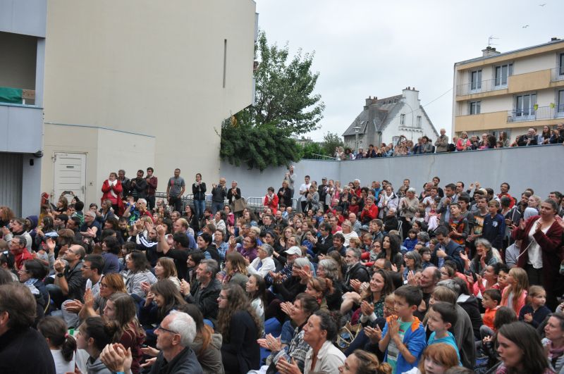 Avant le spectacle, le public afflue vers la rue des Artificiers qui déborde très vite de monde. Pas loin de 1000 personnes sont présentes, certains assis sur les moquettes tandis que d’autres observent par leurs fenêtres et balcons les spectateurs qui envahissent leur parking. Les riverains ont d’ailleurs eu l’occasion la veille de partager un moment avec les artistes de la compagnie qui était présents sur les lieux pendant deux jours pour préparer leur spectacle.