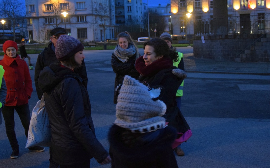 Caroline Raffin, nouvelle directrice du Fourneau, Cécile Le Meignen, co-directrice de la compagnie Les Fugaces et Servan-Yves Denes, régisseur, prennent la parole. Un mot pour contextualiser le travail de la compagnie en résidence depuis le 29 janvier à Brest, l’importance de l’expérimentation des circuits de leurs 5 déambulations simultanées, du test du matériel sonore, du travail de gestion du public pour les acteurs, avec un public attentif et bienveillant, qui sera invité à l’issue de la représentation à échanger avec les artistes sur ce qu’ils ont pensé, ressenti, aimé, ou pas... et quelques consignes de sécurité pour se déplacer dans une ville en mouvement, alors que l’on est happé par la vie du personnage qui nous embarque dans son monde !
