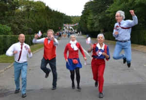 With six actors and myself we devised three pieces that would be featured throughout the day following the story of the creation of a new territory, Franglaterre. The work was always focused on the spirit of celebration, light and playful since throughout the day’s events a lot of our performances that we programmed would touch on deeper matters. Wet Picnic’s role was to provide a link, to connect people during the day and to share a story. One of our actors is from Bretagne, and together we found a story of the Johnny’s who would sell pink onions to the English on their bicycles. It was an important link between the French and the English, something of sharing that we wanted to bring to the public. We worked through improvisation and created characters that would be able to connect to an audience of over 2500. The work was an introduction for many to performing in the street, something that is much more welcomed in France than in England, and so it was exciting for us to be able to perform to a French audience.