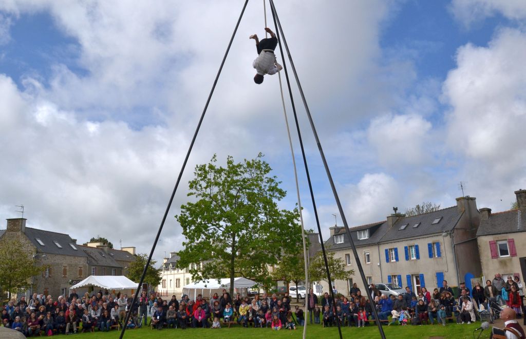 A 12H12 et quelques secondes, la compagnie Hydragon ouvre la 7ème édition du Printemps des Arts de la Rue en Pays des Abers, place Rohan à Coat-Méal. Quelques 300 spectateurs découvrent La Corde et On, une création mêlant avec brio poésie et performance.